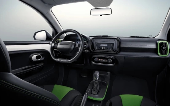 内饰方面,新车整体采用黑色作为底色,但在出风口、座椅处都有着荧光绿色作为装饰。作为入门微型纯电车,其采用了双辐方向盘和指针式仪表盘,中控区域也仅有造型简单的多媒体系统。配置方面,新车将提供拼色皮质运动座椅、驾驶席4向手动座椅、副驾驶席4向手动座椅、主副驾一触式防夹电动车窗、Push Start一键启动功能、智能钥匙X2、开关门车窗防耳鸣智能升降 、车内中控锁、外后视镜电动调节、外后视镜手动折叠、前阅读灯、前排12V电源、随车充电枪、全车隔热绿玻璃等。