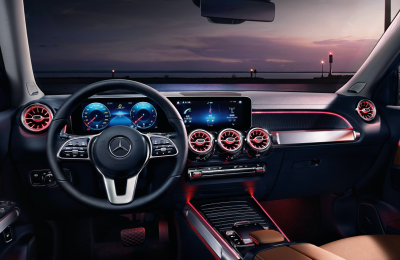 内饰方面,新车采用了全液晶仪表盘与中控多媒体显示屏相链接的联屏设计,并搭配了采用了三辐式多功能方向盘以及怀挡换挡设计,内饰整体设计都彰显了豪华质感。配置方面,新车第二排出风口附近的USB口变为了1个,GLB 200 时尚型的轮圈变为了双色五条辐的战斧样式;其他方面,新车依旧配备了全景天窗、雨量传感器的雨刷、自动空调、驾驶员腰部4向支撑、定速巡航、智能人机交互、智能手机互联等配置。