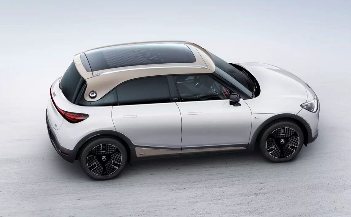 车身侧面,新车采用了当前非常流行的双色车身设计,并配有无边框车门与隐藏式门把手。值得一提的是,新车B柱附近配有奔驰相关标识,D柱上则贴有smart LOGO。此外,新车配有一款颇具电动车风格的三辐式低风阻轮圈,同时,侧裙以及轮拱处的护板也可以让车辆显得更加动感。
