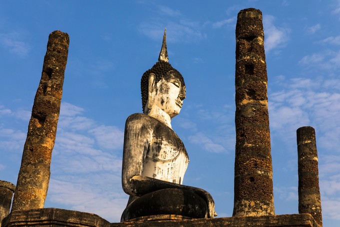 站在沙攀辛寺大殿的面前,可俯瞰素可泰古城。太阳从被薄雾所环绕的素可泰古城冉冉升起。