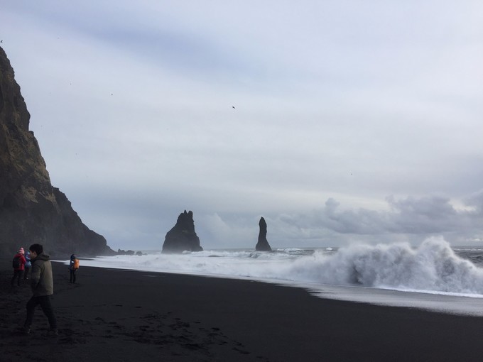 接下来就是黑沙滩啦。黑沙滩景点距离维克镇还有不远的距离,又翻了那座来的时候风雨交加的小山,白天的景色完全不同,真是不敢相信这就是来的时候那个开得特别惊险的山。翻过山还要拐入一条小路,一直开到海边才抵达维克黑沙滩。这里的沙子真的是黑色的,而且风浪确实特别大,不愧是冰岛危险指数排名第一的景点,据说这里的浪七次就有一次大浪,大浪拍到黑沙滩上,产生巨大的声响,留下一沙滩的白色泡沫,人类显得特别渺小。黑沙滩真是适合暗黑系,适合阴天来看,而今天偏偏又有点晴,可想而知如果是阴天再加上大风会是多危险。