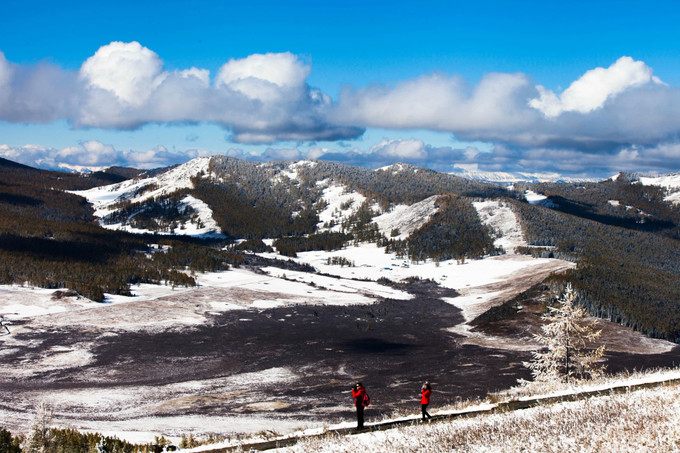 区间车从喀纳斯绕着山路就进山了,司机在一处高原草甸停了车,这里视野非常开阔,远处的雪山、山下的松树林、脚下的草甸、蔚蓝的天空、漂浮的云朵。